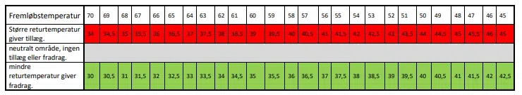 | % tillæg pr. grad over/under grænse for returtemperatur | 0,3 | 0,6 | 0,9 | 1,2 | 1,5 | 1,8 | 2,0 |